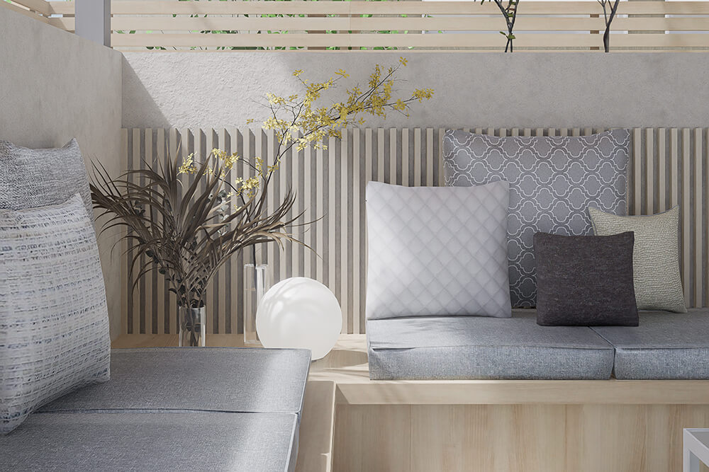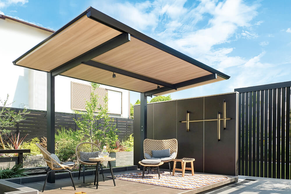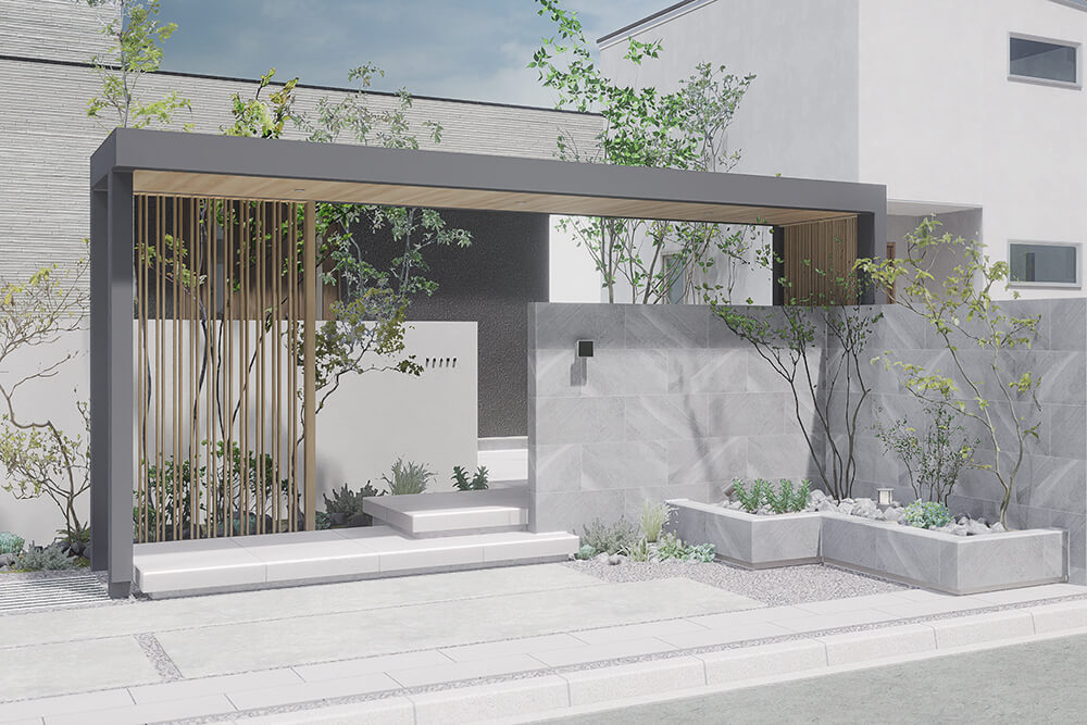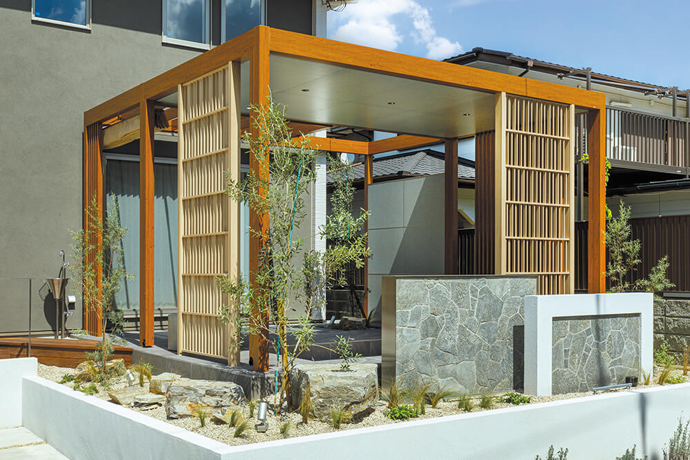 モノトーンの落ち着いた色使いにあたたかな木目を組み合わせたり、シンプルで落ち着いた植栽を配置したりすることで、屋外でも洗練されたジャパンディ空間を演出できます。