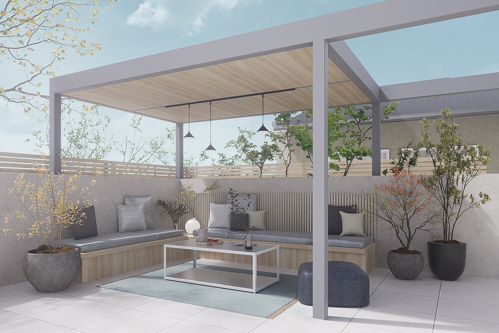 テラスには「ホームヤードルーフⅡ」を採用し、風通しの良いスクリーンやデザインパネルを使用することで圧迫感を軽減。風になびく姿が美しいグラス類の植栽を多く取り入れることで、涼し気な印象を与えます。