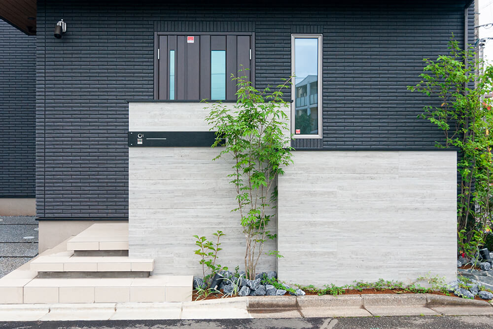 グレーを基調としたカラーは植栽との相性も抜群。無機質になりすぎず、植栽の緑と調和することで、外構全体を美しく引き立てます。