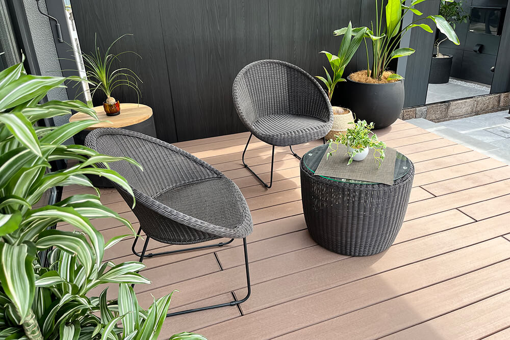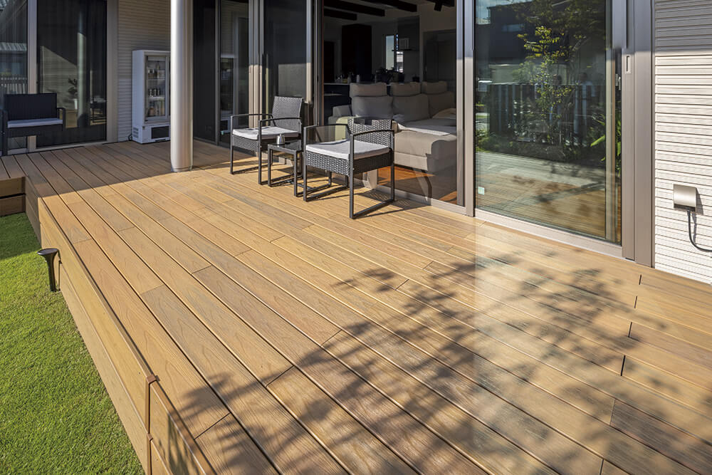 人工木デッキでありながら、天然木のようなぬくもりと質感にこだわり、心地よく過ごせる空間を演出してくれます。さらに、水や油汚れが染み込みにくい構造のためお手入れも簡単。美しい状態を長く保てる点も、自宅サウナのある庭に最適です。