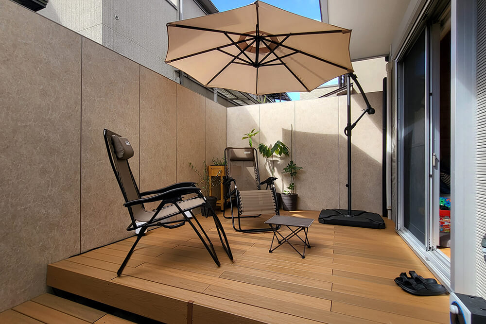 床材はタイルデッキとウッドデッキを組み合わせ、高級感のある仕上がりに。