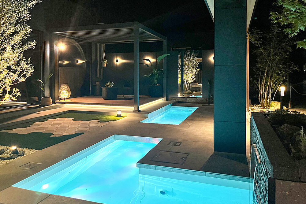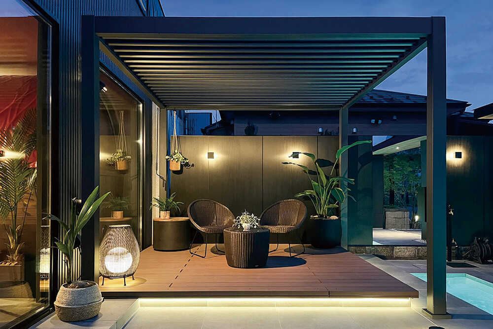 スタイリッシュなデザインに、開閉式のルーバー屋根を備えたテラスで、日差しを遮りたいときは屋根を閉じ、夜空を楽しみたいときはルーバーを開けるなど、シーンに合わせた使い方が可能です。