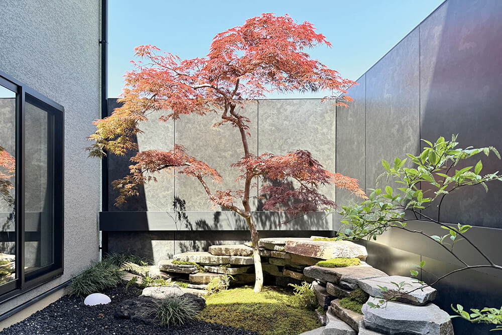 限られたスペースを活かし、モミジを主役に据えた和モダンの坪庭事例です。