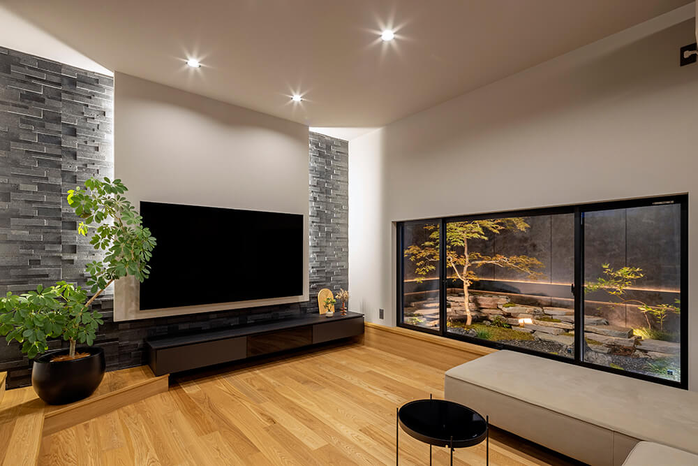 昼は明るく爽やかな景色として、夜はライトアップされた庭が落ち着いた背景として空間を彩ります。庭を「外構」としてではなく、「暮らしの中の景色」として取り込んだ、和モダンならではの住まいづくりの好例です。