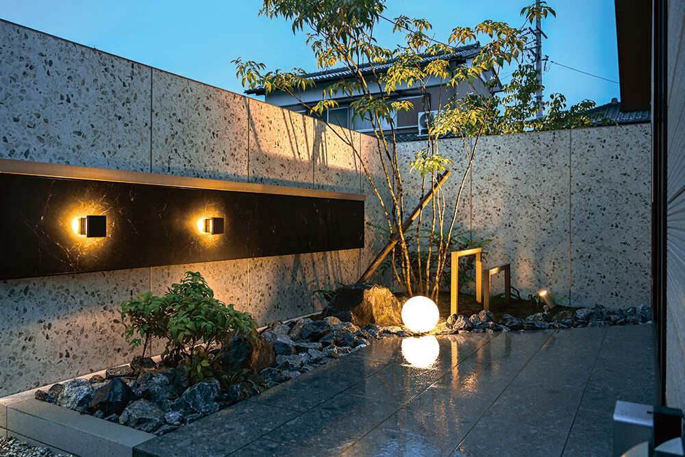 壁面に設けた間接照明が、植栽や石の陰影をやわらかく浮かび上がらせ、落ち着いた雰囲気を演出。足元の照明は光源を抑え、眩しさを感じさせない設計となっています。