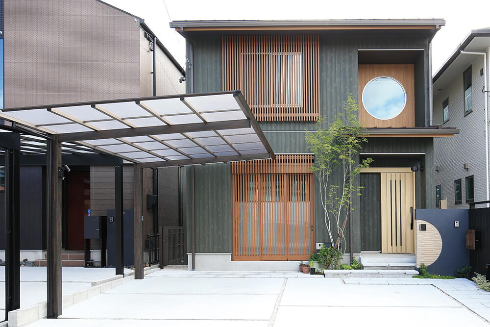 こちらはタカショーの「アートポート」を採用した事例です。深いグリーンの外壁や格子や円窓が映える和モダン住宅に、木目調カーポートをコーディネート。片側2本柱のすっきりとした構造が、建物の端正な佇まいを引き立てながら、自然に景観へと溶け込んでいます。